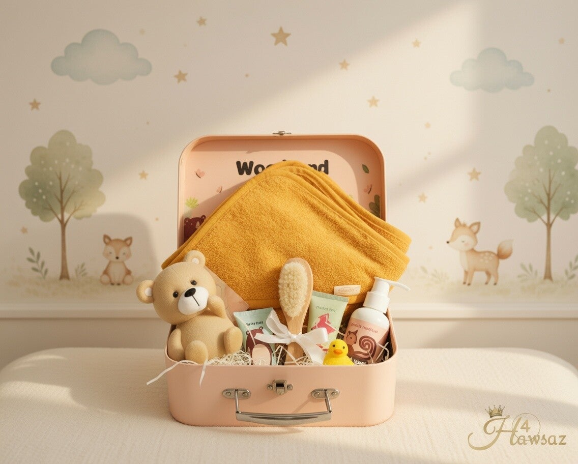 Weet je al de naam van het kindje? Maak het pakketje nog specialer en persoonlijker door de naam van het kindje te laten borduren of graveren! Heb je interesse? Stuur ons dan een e-mail op info.hawsaz@gmail.com. Als we binnen 1 uur geen reactie ontvangen, versturen we het pakketje zonder naam.